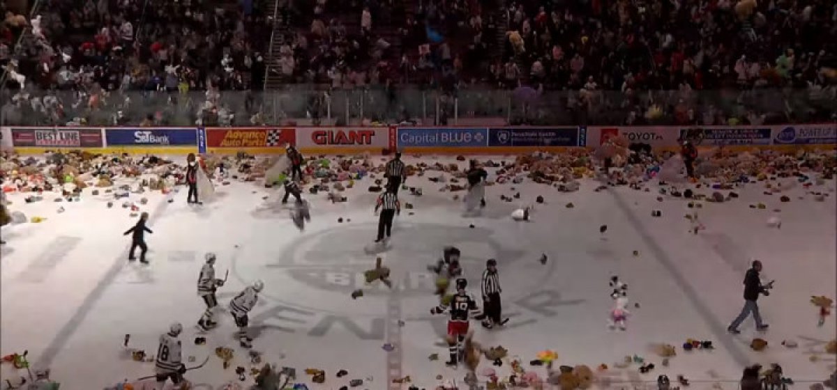 Для справки. Подобного рода события в американском хоккее называется Teddy bear toss — ежегодная благотворительная акция, которая проводится в канун Рождества с 1993 года. Суть в том, что болельщики хозяев арены бросают на лед плюшевые игрушки после первой забитой шайбы их командой. На это время матч останавливают, игрушки собирают, а потом распределяют по школам, детским домам, церквям и приютам. В декабре прошлого года фанаты американского хоккейного клуба «Херши Беарс», который выступает в АХЛ и является фарм-клубом «Вашингтон Кэпиталз», установили мировой рекорд по количеству выброшенных игрушек на поле - их количество составило свыше 45 тысяч.